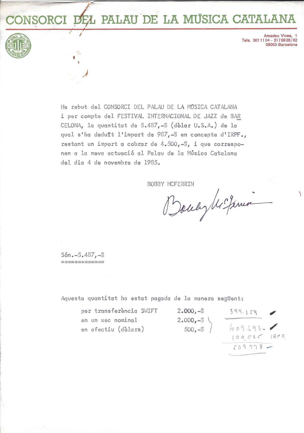 Rebut firmat per Bobby McFerrin per la seva actuació al Palau el 1985