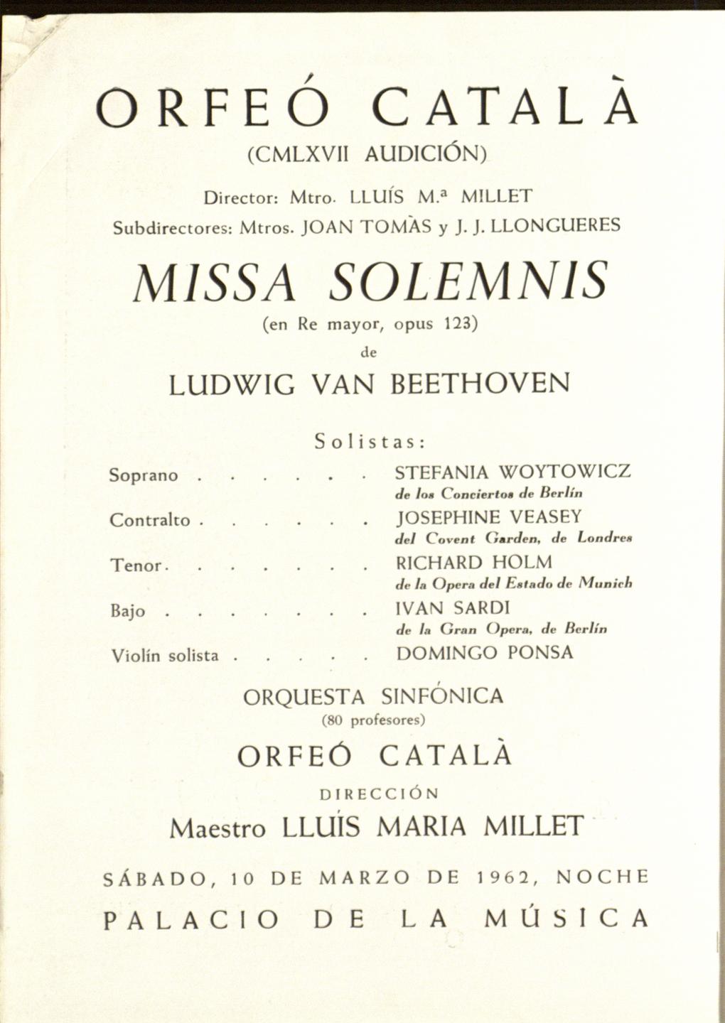 Programa de la Misa Solemnis de Beethoven per l'Orfeó Català, l'any 1962. Joan Tomàs, sotsdirector. CEDOC