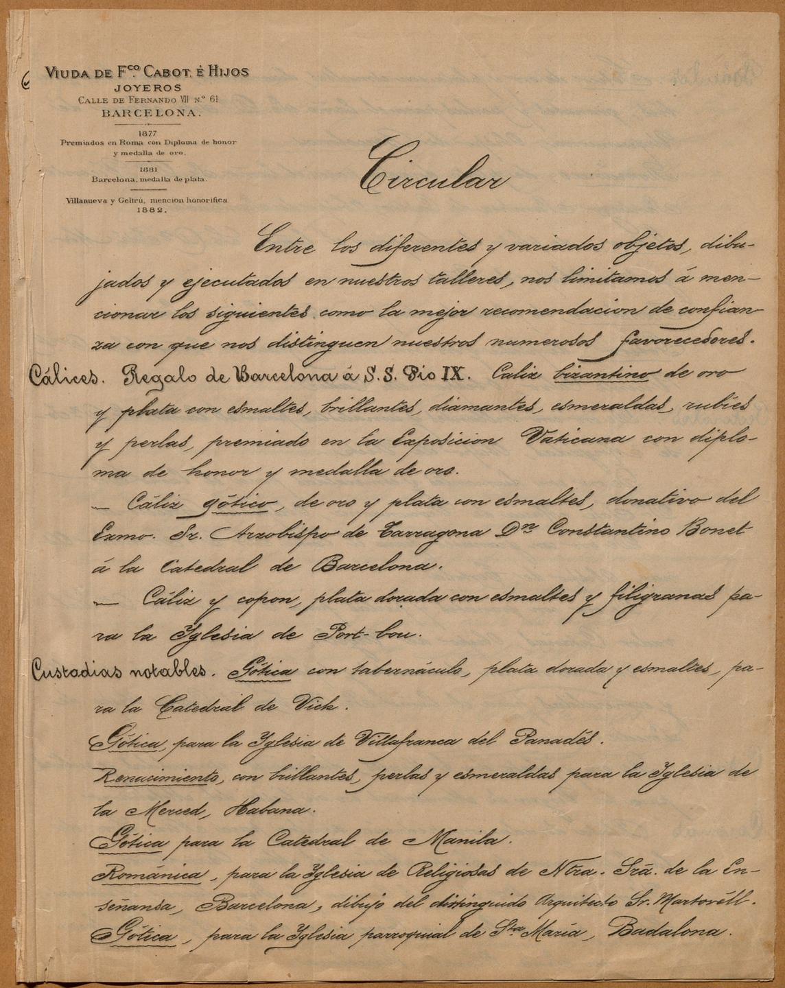 Circular manuscrita emesa per la vídua de Cabot en la qual s’expliquen amb tot detall les peces més destacades que ha realitzat el seu taller de joieria.