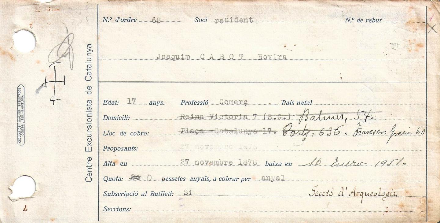 Fitxa de soci número 2, pertanyent a Joaquim Cabot i Rovira. Secció d’Arqueologia. Alta: 27 de novembre de 1878. Baixa: 16 de gener de 1951.