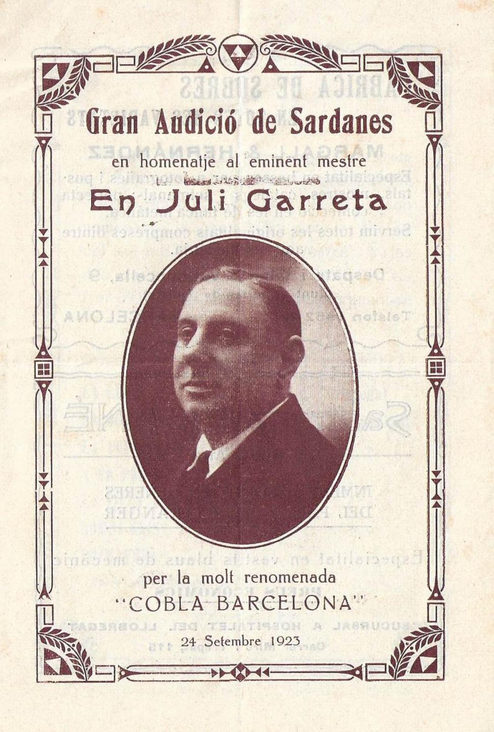 Programa de l’audició en honor de Juli Garreta durant les festes de la Mercè del 1923 en què la Cobla Barcelona va estrenar-ne la darrera composició per a cobla: La llar.