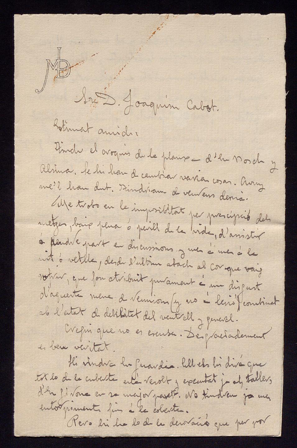 Carta de Lluís Domènech i Montaner dirigida a Joaquim Cabot sobre el avance de la construcción.