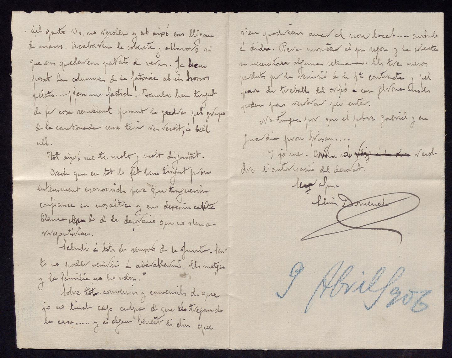 Carta de Joaquim Cabot dirigida a Lluís Domènech i Montaner, en la que se habla sobre el arco esculturado de la boca del escenario que se finalizó después de la inauguración. También se habla sobre la colocación de las vidrieras, a cargo del vidriero Antoni Rigalt , para tener a punto el edificio para la inauguración inminente del mes de febrero, así como unas pinturas decorativas de la Sala de descanso (actual Sala Lluís Millet ) que al final no se realizaron. 22 de enero de 1908