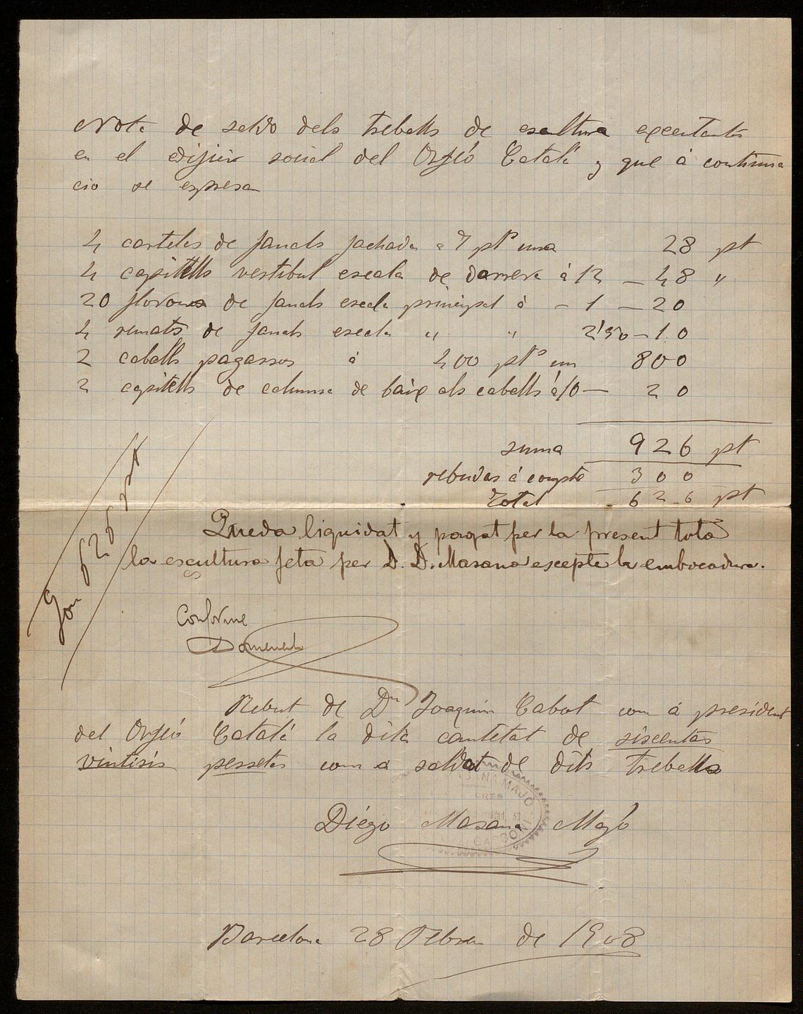 Recibido con los detalles del encargo en el escultor Dídac Masana y la firma de conformidad de Domènech i Montaner, donde se especifica que queda liquidada toda la intervención de la escultura excepto la boca del escenario.
