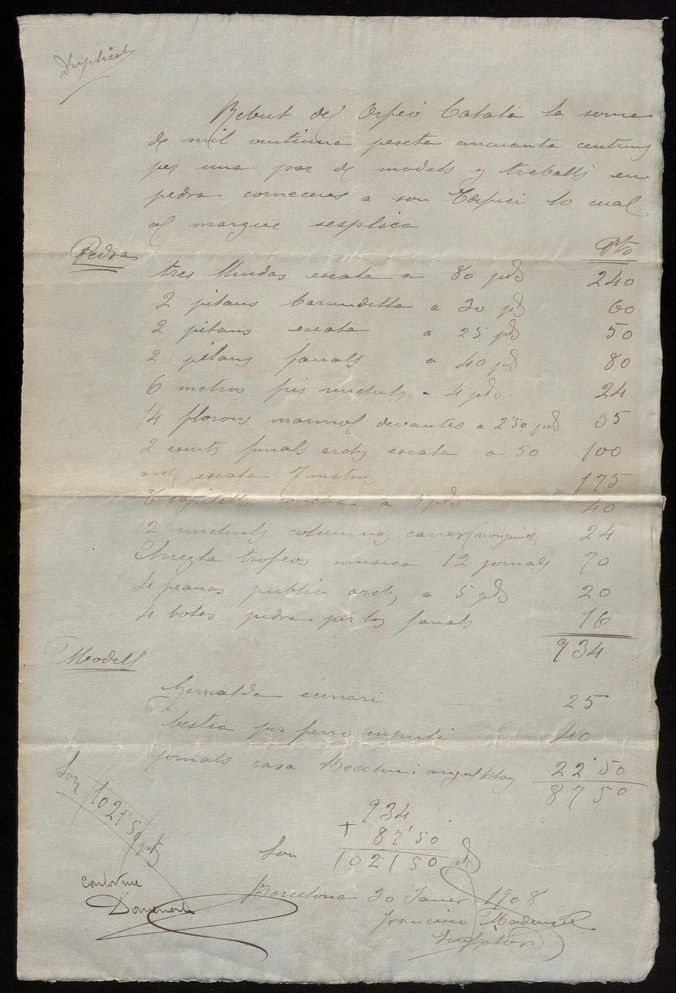 Recibo de las tareas realizadas por el escultor Francesc Madurell, por los modelos y trabajos en piedra en espacios como los umbrales y pilares de escaleras, florones de mármol, capiteles en forma de cáscara, entre otros. 30 de enero de 1908.