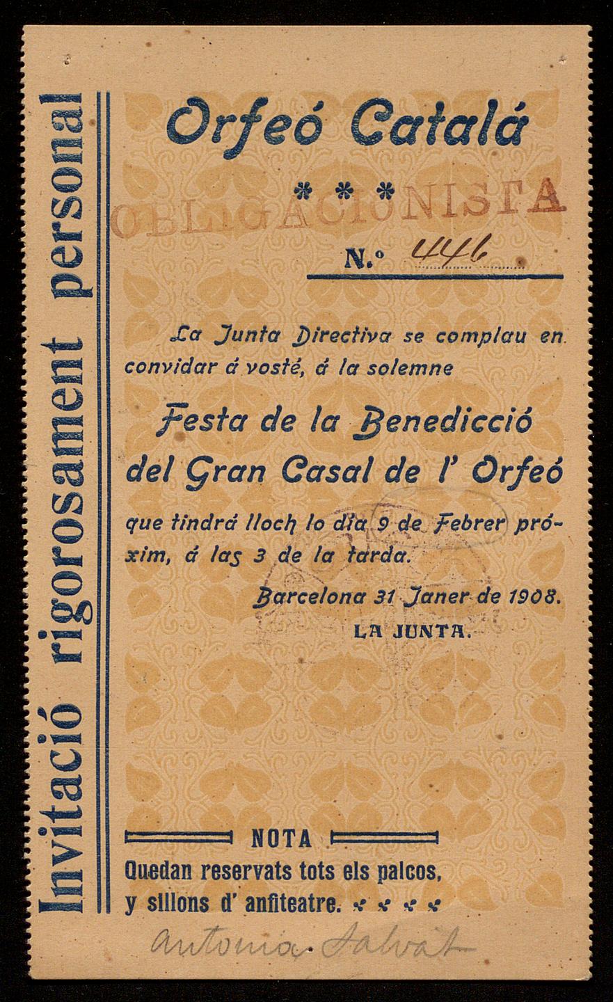Invitación a la fiesta de bendición del gran Casal del Orfeó Català. 31 de enero de 1908.