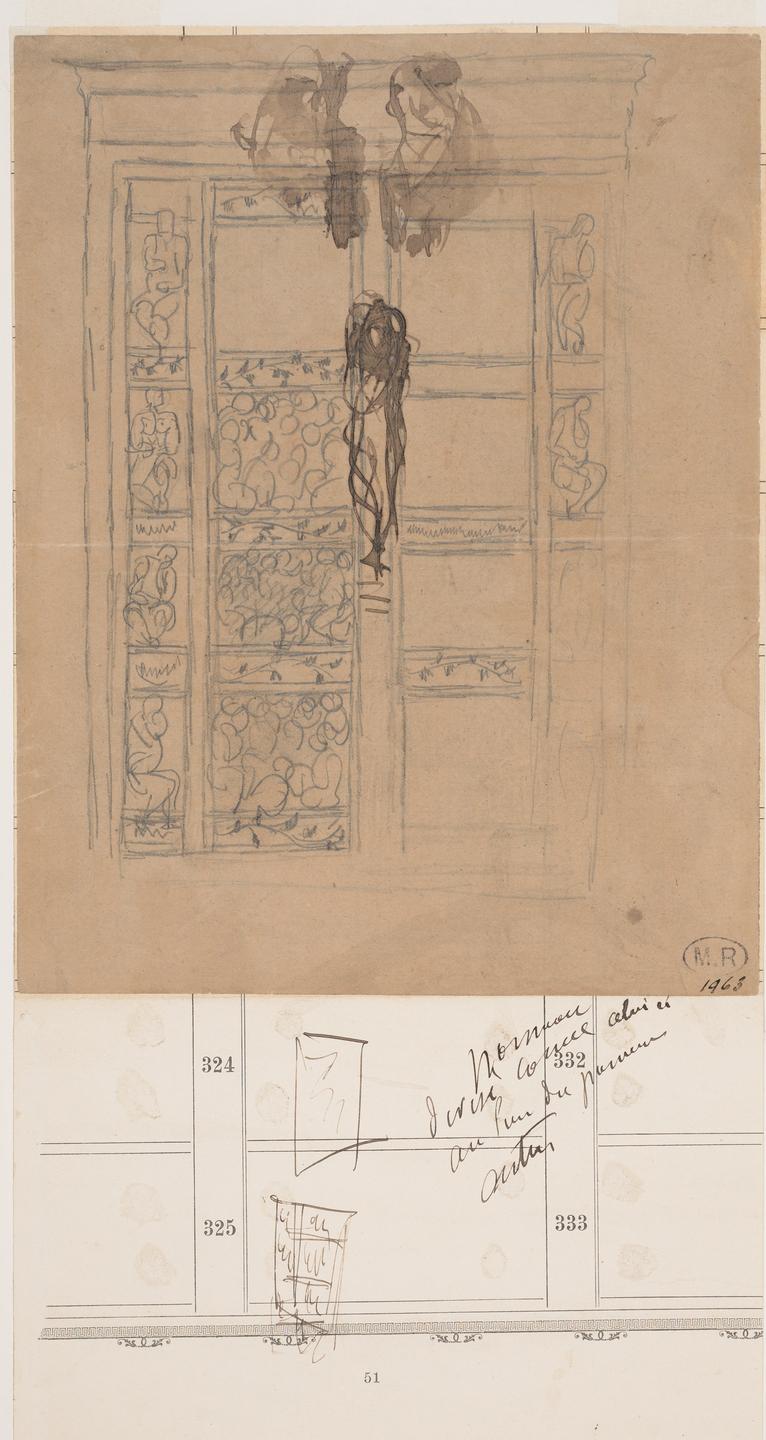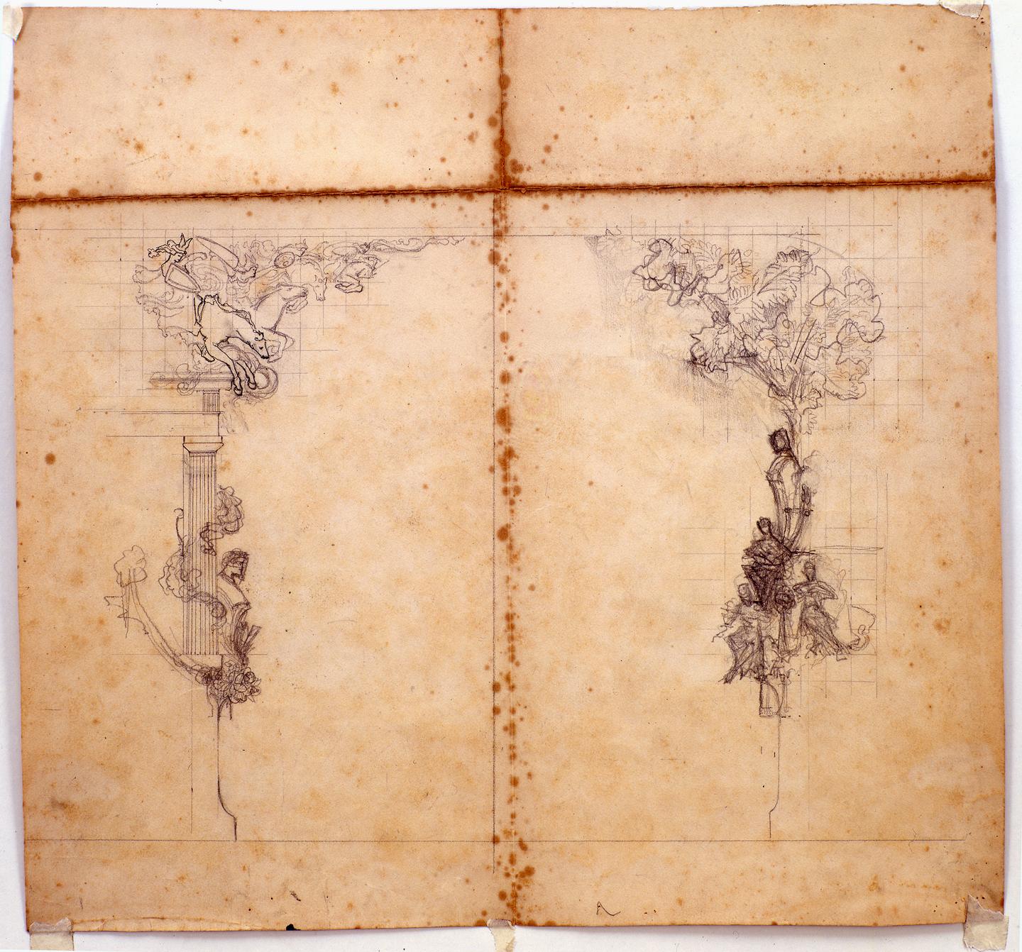 Boceto del trabajo escultórico de la boca del escenario del Palau de la Música Catalana. Dibujo a tinta de Lluís Domènech i Montaner. Fondo: Lluís Domènech i Montaner. Archivo Histórico del Colegio de Arquitectos de Cataluña.