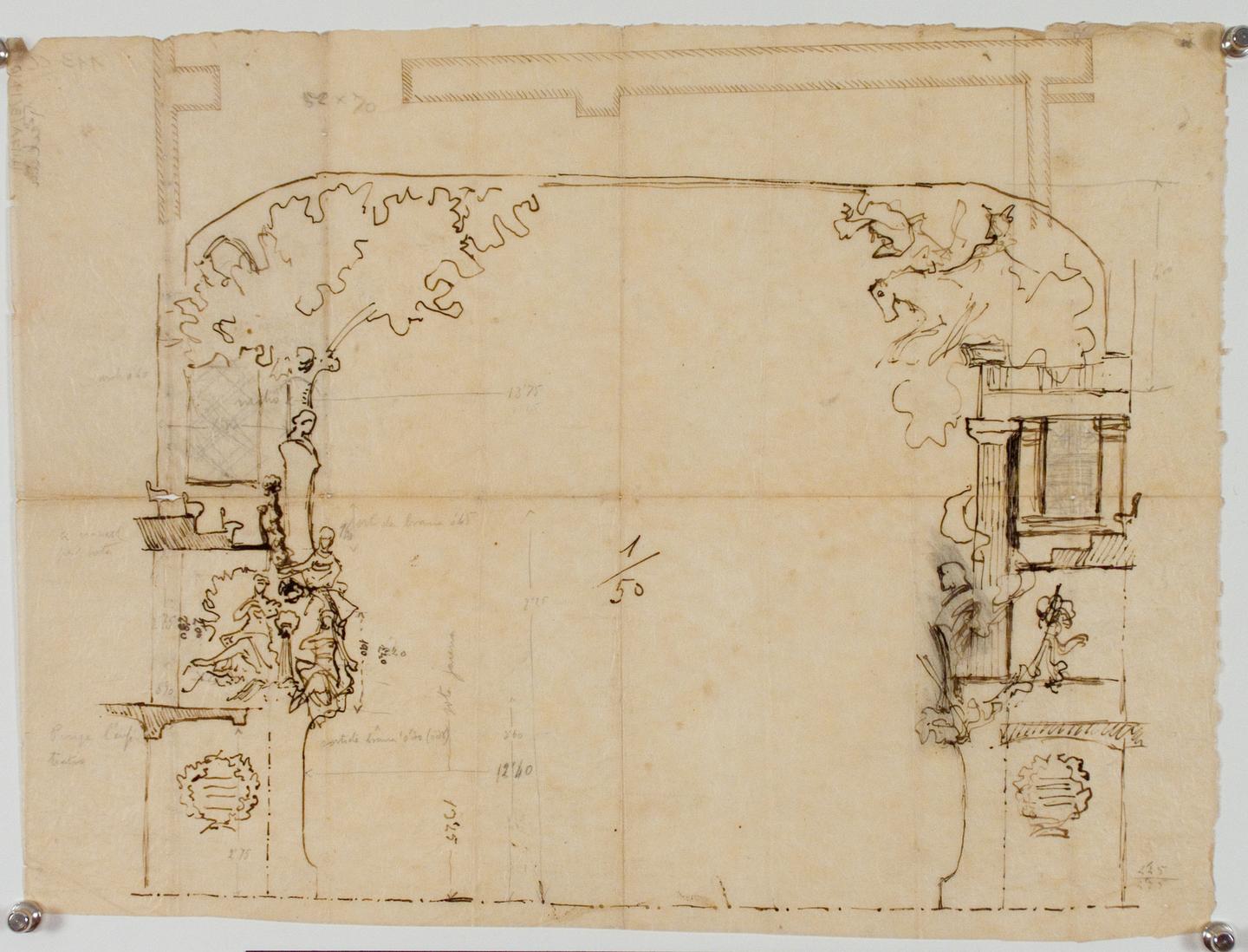 Boceto del trabajo escultórico de la boca del escenario del Palau de la Música Catalana. Dibujo a tinta de Lluís Domènech i Montaner.