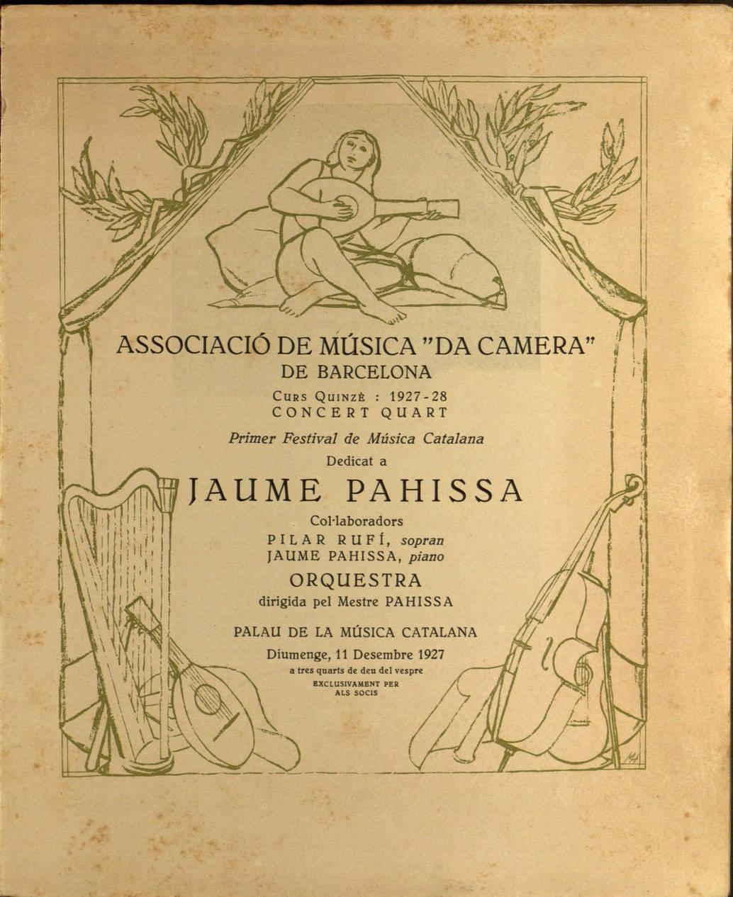 Jaume Pahissa i Jo nació en Barcelona el 8 de octubre de 1880, hijo de Jaume Pahissa i Laporta, un gran pintor paisajista. Tras estudiar unos años arquitectura en la Universitat de Barcelona, sus intereses derivaron hacia la música. Pahissa se sumergió en el calor del movimiento modernista barcelonés y los locales que frecuentaban los artistas amigos de su padre, como Els Quatre Gats. Asimismo era un asiduo en el Ateneu Barcelonès, donde concedía entrevistas a los periodistas y escribía sus artículos como crítico musical de «La Publicitat», además de compartir tertulias con artistas e intelectuales. Sus amigos y colegas eren artistas y pensadores de la época: Enric Granados, Eugeni d’Ors, Pau Casals, Manuel de Falla, el escenógrafo Rafel Moragues, Enric Morera, o la cantante Conxita Badia, entre otros.